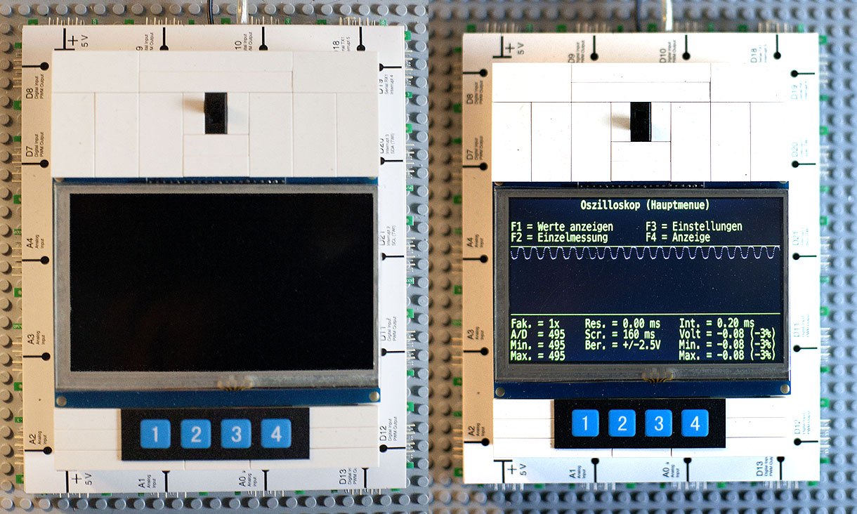 Das Display ist ein hintergrundbeleuchtetes 5" RGB-TFT-Touch-Display mit 800 x 480 Punkten Auflösung. Auf dem rechten Foto läuft eine Oszilloskop-Software.